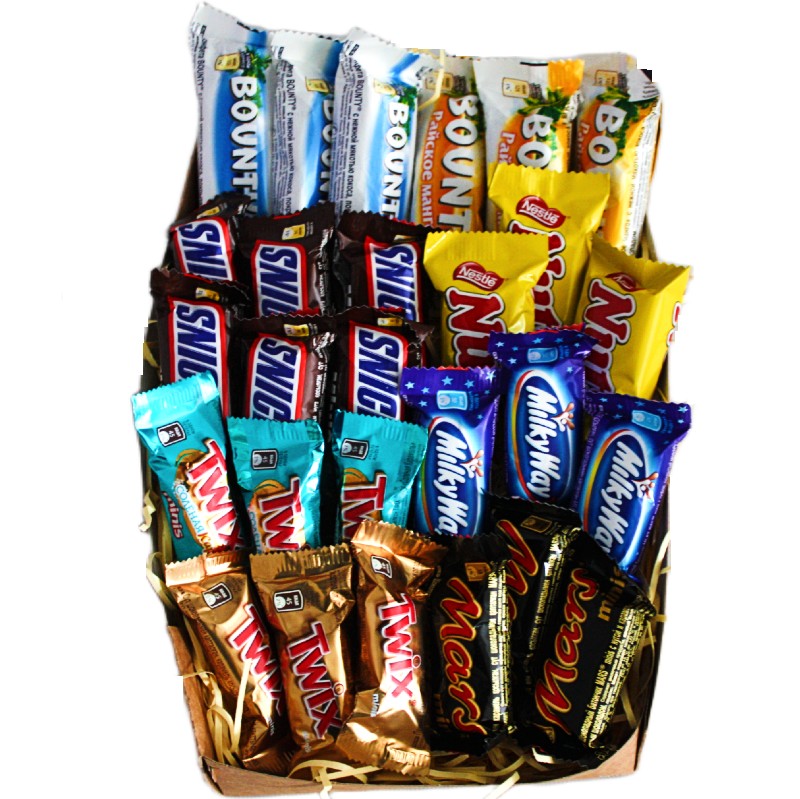 Подарочный набор мини-сладостей включает: конфеты Марс мини - 3 шт. конфеты Сникерс мини - 6 шт. конфеты Твикс мини - 6 шт. конфеты Баунти - 6 шт. конфеты Милки Вей - 3 шт. конфеты Натс Мини - 3 шт. Сладкий подарок упакован в подарочный бокс с красивой красной лентой. Внутри знакомые с детства любимые вкусы конфет Марс с нугой, Сникерс с орехами, Натс с орехом, Баунти с кокосом и Милки Вей с нежной нугой. Шоколадный набор отлично подходит в качестве подарка коллеге, начальнику на День рождения, к профессиональному празднику, на 23 февраля и 8 марта. Иногда подарочный бокс выбирают в школу для учителя и преподавателя. В детском саду дарят одногруппникам или воспитателю.