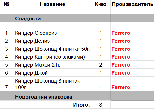 Киндер Сюрприз (1 шт), Киндер Делиз (1 шт), Киндер Шоколад 4 плитки 50 гр. (1 шт), Киндер Кантри (со злаками) (1 шт), Киндер Макси 21 гр. (2 шт), Киндер Джой (1 шт), Киндер Шоколад 8 плиток 50 гр. (1 шт)
